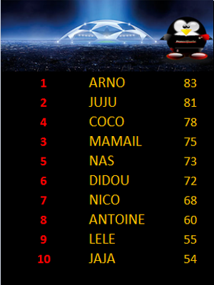 Tout les participants encore en course, c'est à dire les 3 premiers, n'arrivent pas à se départager. Ils marquent tous 2 points ce qui ne change rien au classement. Rien n'est joué cependant puisqu'il reste 5 points à prendre (2 sur la finale si score juste + équipe championne.
