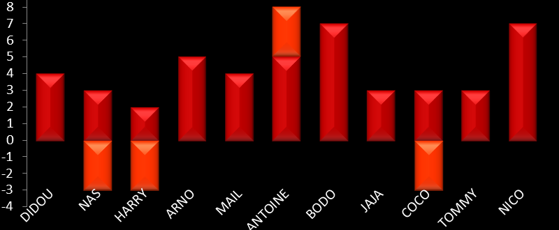 Coco (+5) ne répond pas aux espoirs placés en lui en début de saison alors que Tommy (+7) n’aura pas fait mieux que la 9ème place en cette première partie de championnat !