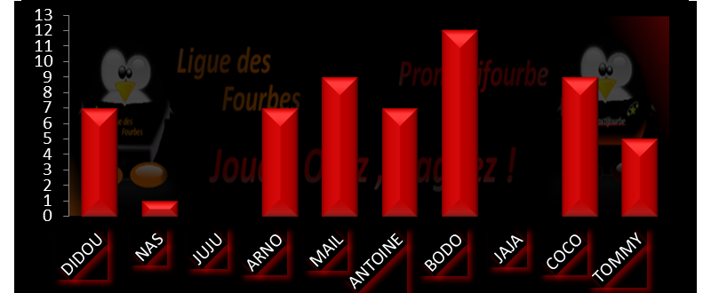 Ils sont tombés dans le piège de Didou ! Jaja (6-3), Nico (5-3) et Arno (5-3) perdent 3 points sur le match joker proposé. Conséquence : Ils se retrouvent tous les 3 en bas du classement général avec 8, 9 et 11 points.