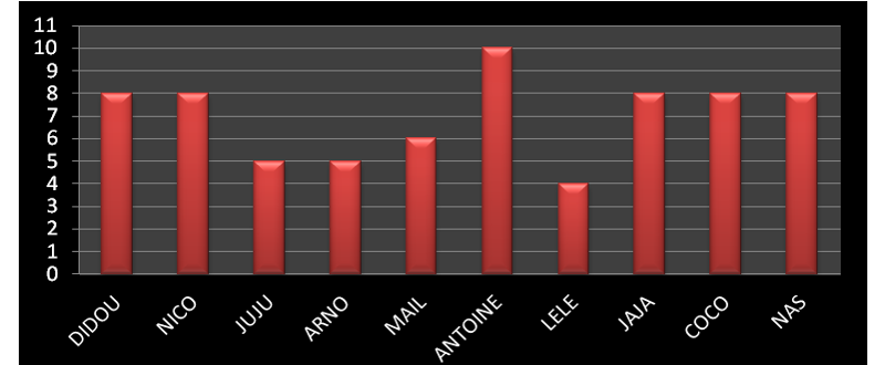 Alors qu’il semblait aspiré par le fond du classement, Antoine sort la tête de l’eau et réalise une prestation convaincante. En particulier parce qu’il à suivi les 2 matchs joker et la à gagné. Concernant ses pronostiques il profite du procurifourbe et s’en sort bien. (6-2+3+3).