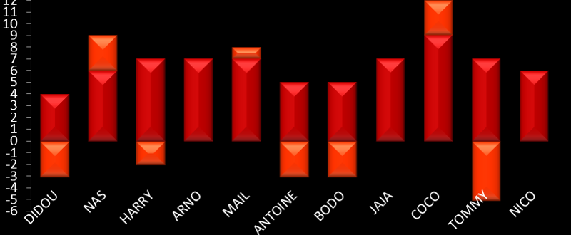 Au jeu des montagnes russes Tommy (7-3-2 procu) perd 2 places et se retrouve dans le bas du classement alors que Nas (6+3) ne se laisse pas enneigé par le match joker glissant et dangereux d’Arno (+7).