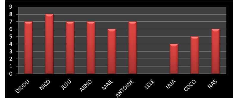 Antoine et Juju cumulent aussi 7 points alors que Jaja (+4) s’effondre et se retrouve à la 7ème place.