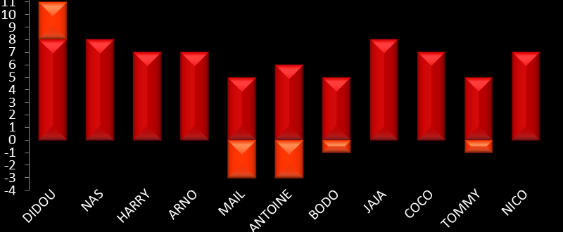 Et revoilà Harry (+7) ! Dernier certes mais plus tout seul ! Il partage dorénavant sa dernière place avec Antoine (6-3) qui perd son 10ème match joker de la saison !