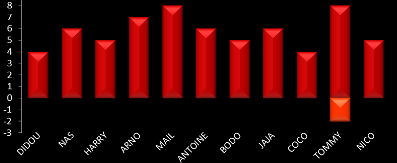 Le procurifourbe est encore de mise ! Ainsi, Didou ,Nas et Jaja marquent 7 points. Ce dernier devient donc lanterne rouge à la place de Tommy (+9)