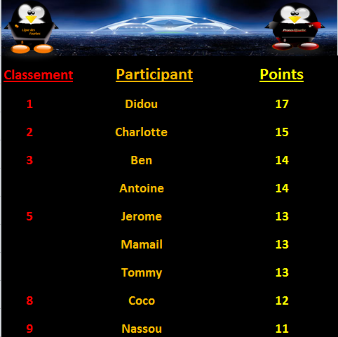Je rappel que toute la grille doit être complétée : matchs aller & RETOUR, nom du buteur, équipe championne, et 3 matchs bonus (mettre un + dans la case du match bonus souhaité, permet de doubler les gains).
